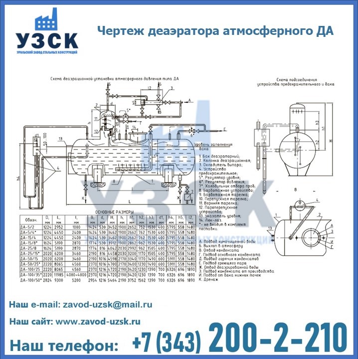 Приобрести качественное оборудование, в том числе, деаэраторы ДА, можно в компании УЗСК в Благовещенске. Мы предлагаем долговечную и надежную продукцию по приемлемой цене. Заказать и купить деаэраторы или другие изделия высокого качества можно через сайт Уральского Завода Стальных Конструкций, или позвонив по указанному в разделе «Контакты» телефону.
